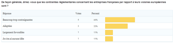 « De façon générale, diriez-vous que les contraintes réglementaires concernant les entreprises françaises par rapport à leur voisines européennes sont ?« , janvier – mars 2012